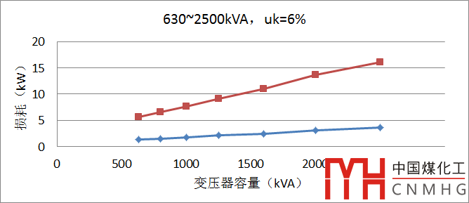 同樣,當(dāng)變壓器的阻抗電壓為6%,其容量與空載損耗、負(fù)載損耗有相似的關(guān)系。參見圖3,紅色曲線為Pk,藍(lán)色曲線為Po。