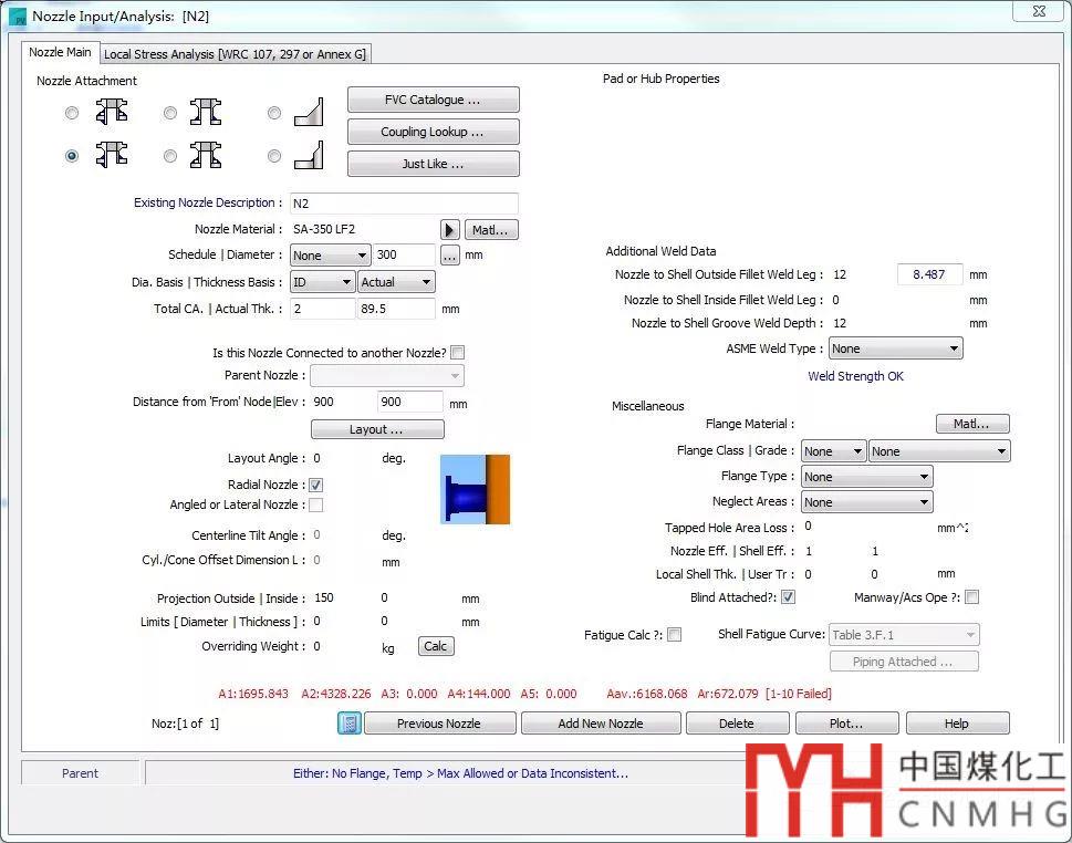 夾套內(nèi)壓需要厚度才7點(diǎn)幾,取的12mm。筒體富裕量很大嘛。所以繼續(xù)進(jìn)行開(kāi)孔補(bǔ)強(qiáng)計(jì)算。內(nèi)徑300,壁厚89.5試試,WTF,紅色警告,不通過(guò)?