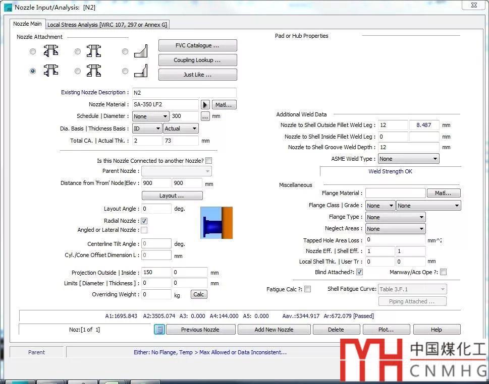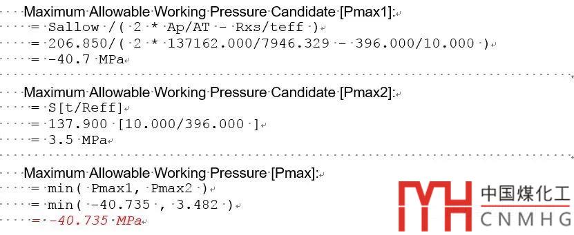 檢查一下計(jì)算書(shū),由于是大開(kāi)孔,程序按照ASME VIII I 1-10計(jì)算。在計(jì)算過(guò)程中因?yàn)镻max1等于負(fù)值,導(dǎo)致Pmax為負(fù)值,所以Pmax永遠(yuǎn)小于設(shè)計(jì)壓力,從而導(dǎo)致無(wú)論如何都不通過(guò)。