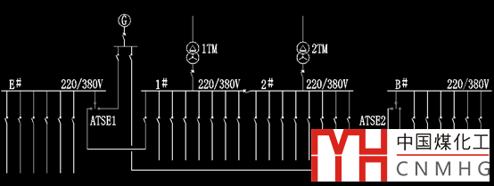 (B#為備用母線,E#為應(yīng)急母線,1#、2#為普通負荷母線。E#、B#共用柴油發(fā)電機組G分別作為應(yīng)急電源和備用電源)