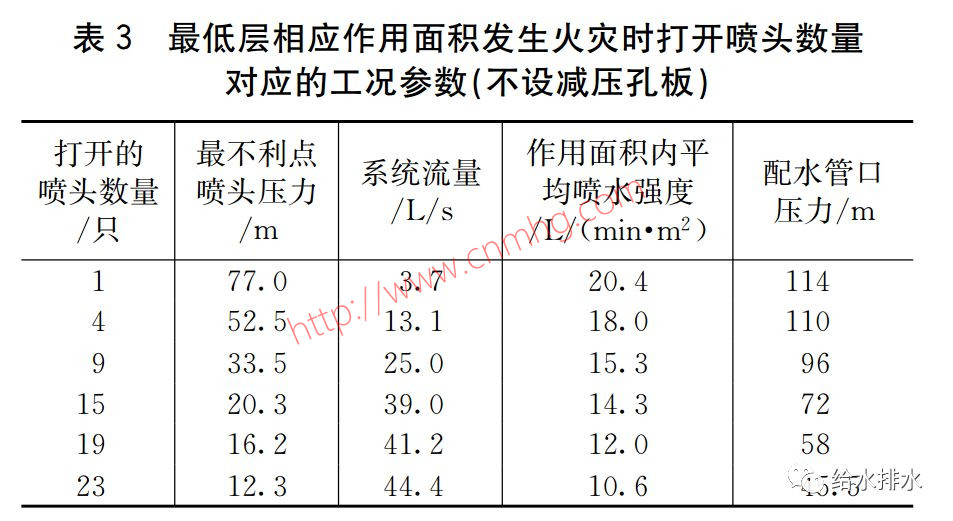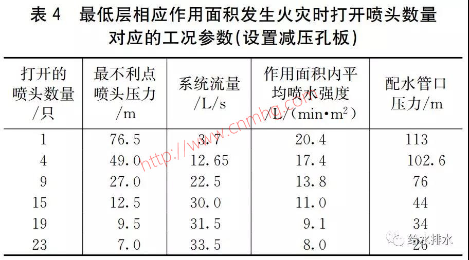 對最低層相應作用面積,設置了減壓孔板后,火災初期系統(tǒng)的噴水強度及噴頭流量接近于最低層相應作用面積未設置孔板時的數(shù)值,當火災面積接近或超過設計作用面積時,噴水強度及噴頭流量更接近于最高層最不利作用面積的數(shù)值,即火災初期提供與不設減壓孔板時相近的噴水強度,火災面積接近或超過設計作用面積時,有效限制了系統(tǒng)供水能力,使火災面積內(nèi)的滅火條件與滅火能力更接近于最高層最不利作用面積。