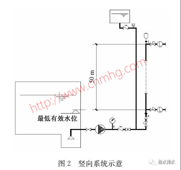 下面通過某建筑的自動噴水滅火系統(tǒng)運行的模擬,分析減壓孔板對系統(tǒng)的作用與影響。某建筑火災危險性為中危險級Ⅱ級,噴水強度8 L/(min·㎡),設計作用面積160 ㎡,火災延續(xù)時間1 h。各層平面及自動噴水滅火系統(tǒng)布置相同,最高層與最低層噴頭位置及泵房水池最低水位高差皆為50 m,最不利作用面積附近噴頭布置及計算示意見圖1,豎向系統(tǒng)示意見圖2。