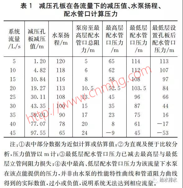 經(jīng)計算,最高層配水管入口處壓力要求為0.35 MPa,選取水泵流量為30 L/s,自動噴水滅火系統(tǒng)總用水量為108 m³,自動噴水滅火系統(tǒng)泵揚程為100 m,零流量時揚程為120 m,流量45 L/s時揚程為65 m,最低層配水管入口計算壓力0.85 MPa,由于《消防給水及消火栓系統(tǒng)技術(shù)規(guī)范》規(guī)定系統(tǒng)工作壓力以水泵零流量壓力計,噴頭處最高壓力不應大于1.2 MPa,最低層噴頭工作壓力已到達1.2 MPa,為規(guī)范規(guī)定的最大值,該樓層為本建筑超壓值最大樓層。在最低層配水管入口設置DN150/Ø45減壓孔板,減壓孔板在各流量下的減壓值、各流量下的水泵揚程、配水管口計算壓力(非實際工況壓力)等數(shù)據(jù)見表1。