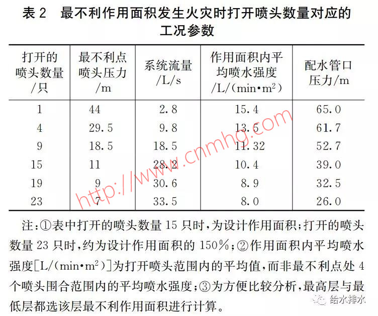 對最低層相應作用面積,火災各階段噴水強度及系統(tǒng)流量將大于最不利作用面積噴水強度及系統(tǒng)流量,由于噴水強度及系統(tǒng)流量與系統(tǒng)壓力為平方根成正比,各階段的噴水強度及系統(tǒng)流量與最不利作用面積的相應數(shù)值約為1.3倍,在火災面積大于設計作用面積時,系統(tǒng)能提供更高的噴水強度及系統(tǒng)流量。由于實例中該作用面積已是系統(tǒng)分區(qū)的最大值(噴頭工作壓力1.2 MPa),在其他樓層,由于大流量使水泵揚程的降低及管網(wǎng)阻力的增大的疊加作用,噴水強度及系統(tǒng)流量將小于以上約1.3倍的數(shù)值。
