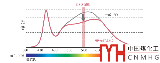 該產(chǎn)品采用特殊芯片,通過光譜控制技術(shù),調(diào)整光譜中570nm~580nm的波長分布,提高光譜中決定美麗程度的三個重要指標(biāo),如圖1所示。