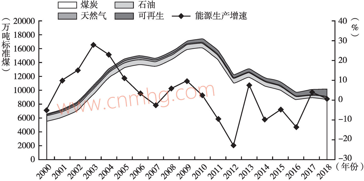 圖1 2000~2018年河南能源生產(chǎn)情況