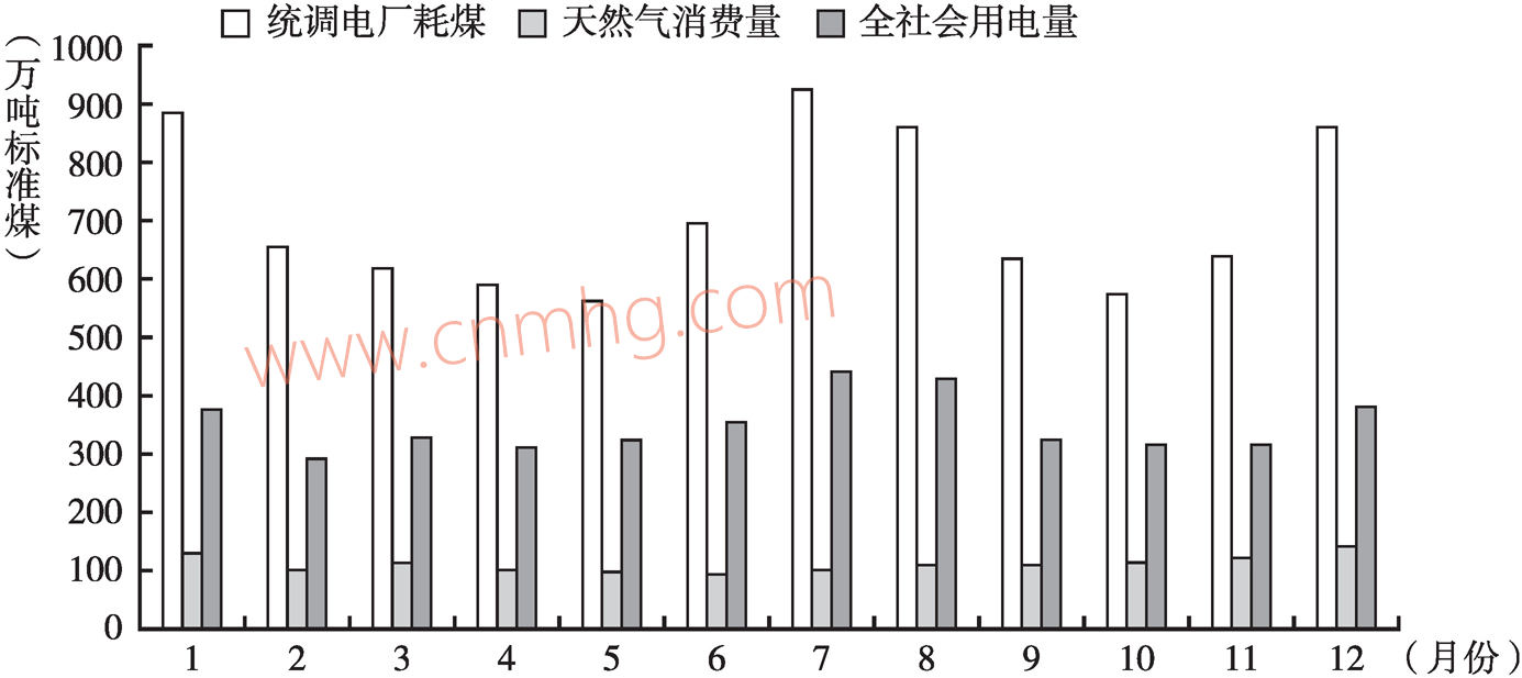 圖3 2018年分月度河南統(tǒng)調(diào)電廠耗煤和天然氣、電力消費情況(折標煤量)