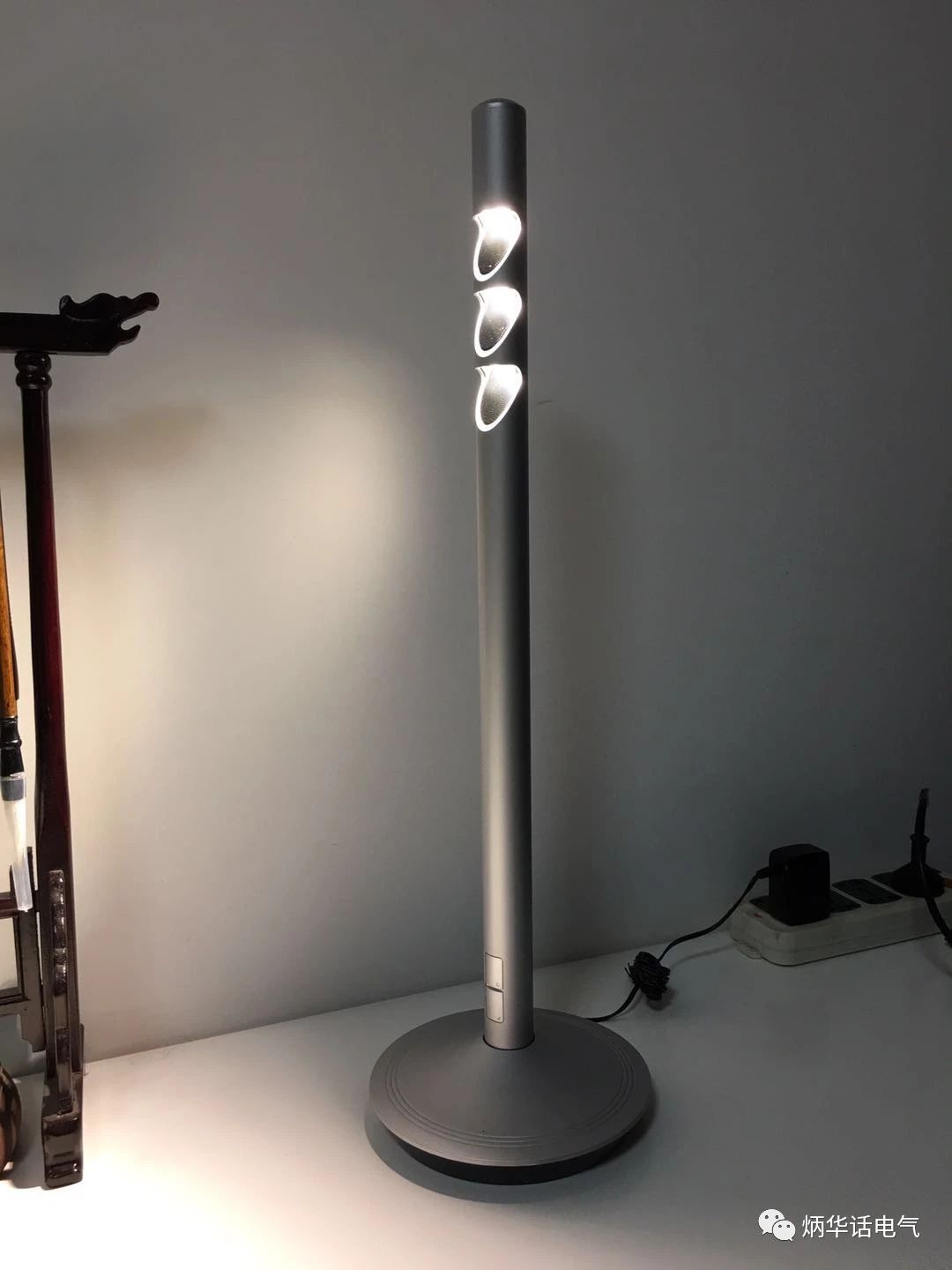 這款燈看上去非常簡潔,灰顏色金屬質(zhì)感的燈具具有工業(yè)品的特征,簡潔的不能再簡潔了。大的底座顯得很厚重,起到穩(wěn)定臺燈的作用。相比之下立柱顯得高高細(xì)細(xì)的,但比例還算協(xié)調(diào),在立柱的頂部區(qū)域開了三個(gè)三角孔,三角孔內(nèi)安裝的是4W的LED光源,共計(jì)12W。