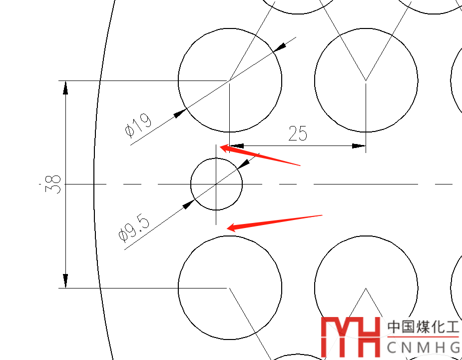 設(shè)計沒有考慮到定距管直徑φ21,換熱管直徑φ19,兩換熱管之間中心距離是38mm。如果安裝上定距管后,肯定超出管孔。
