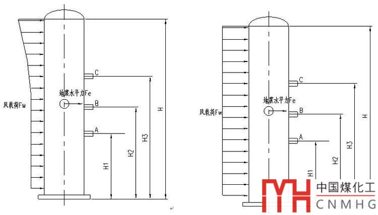 實(shí)情情況如左圖,風(fēng)載荷Fw的風(fēng)壓隨著高度不斷增加,到頂部達(dá)到最大,地震的水平力為Fe可視為在設(shè)備重心。