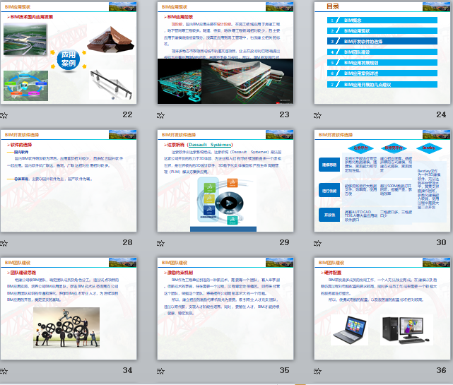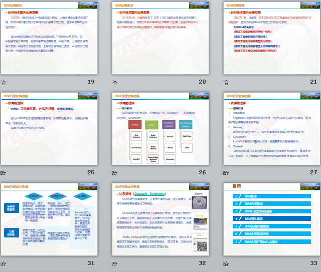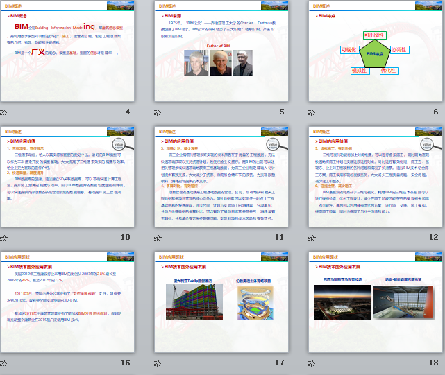 附件大小:25.2MB所屬分類:BIM資料分享會員:芳華分享時間:2021-09-08最后更新:資源簡介/截圖: 1、BM概念 2、BM應用現(xiàn)狀 3、BM開發(fā)軟件的選擇 4、BM團隊建設 5、BM應用發(fā)展規(guī)劃 6、BM應用案例詳述 7、BM應用開展的幾點建議 1、可視化——可視化即“所見所得”的意思,也就是最基本的模型。 2、協(xié)調性——設計、施工、管理過程中各單位、各專業(yè)之間的協(xié)調。 3、模擬性——施工過程模擬、工期模擬、工序模擬及應急模擬等等。 4、優(yōu)化性——通過BIM模型及關聯(lián)的信息,及時發(fā)現(xiàn)問題進行優(yōu)化。 5、可出圖性——改變傳統(tǒng)的二維出圖方式,實現(xiàn)從三維到二維的出圖。 三維渲染動畫,給人以真實感和直接的視覺沖擊。建好的BIM模型可以作為二次渲染開發(fā)的模型基礎,大大提高了三維渲染效果的精度與效率,給業(yè)主更為直觀的宣傳介紹。 BIM數(shù)據(jù)庫的創(chuàng)建,通過建立5D關聯(lián)數(shù)據(jù)庫,可以準確快速計算工程量,提升施工預算的精度與效率。由于BIM數(shù)據(jù)庫的數(shù)據(jù)粒度達到構件級,可以快速提供支撐項目各條線管理所需的數(shù)據(jù)信息,有效提升施工管理效率。 施工企業(yè)精細化管理很難實現(xiàn)的根本原因在于海量的工程數(shù)據(jù),無法快速準確獲取以支持資源計劃,致使經驗主義盛行。而BIM的出現(xiàn)可以讓相關管理條線快速準確地獲得工程基礎數(shù)據(jù),為施工企業(yè)制定精確人材計劃提供有效支撐,大大減少了資源、物流和倉儲環(huán)節(jié)的浪費,為實現(xiàn)限額領料、消耗控制提供技術支撐。 項目管理的基礎就是工程基礎數(shù)據(jù)的管理,及時、準確地獲取相關工程數(shù)據(jù)就是項目管理的核心競爭力。BIM數(shù)據(jù)庫可以實現(xiàn)任一時點上工程基礎信息的快速獲取,通過合同、計劃與實際施工的消耗量、分項單價、分項合價等數(shù)據(jù)的多算對比,可以有效了解項目運營是盈是虧,消耗量有無超標,分包單價有無失控等等問題,實現(xiàn)對項目成本風險的有效管控。 三維可視化功能再加上時間維度,可以進行虛擬施工。隨時隨地直觀快速地將施工計劃與實際進展進行對比,同時進行有效協(xié)同,施工方、監(jiān)理方、業(yè)主對工程項目的各種問題和情況了如指掌。通過BIM技術結合施工方案、施工模擬和現(xiàn)場視頻監(jiān)測,大大減少工程質量問題、安全問題,減少返工和整改。 BIM最直觀的特點在于三維可視化,利用BIM的三維技術在前期可以進行碰撞檢查,優(yōu)化工程設計,減少在施工階段可能存在的錯誤損失和返工的可能性。最后可以利用碰撞優(yōu)化后方案,進行施工交底、施工模擬,提高施工質量,同時也提高了與業(yè)主溝通的能力。 BIM數(shù)據(jù)庫中的數(shù)據(jù)具有可計量(computable)的特點,大量工程相關的信息可以為工程提供數(shù)據(jù)后臺的巨大支撐。BIM中的項目基礎數(shù)據(jù)可以在各管理部門進行協(xié)同和共享,工程量信息可以根據(jù)時空維度、構件類型等進行匯總、拆分、對比分析等,保證工程基礎數(shù)據(jù)及時、準確地提供,為決策者制訂工程造價項目群管理、進度款管理等方面的決策提供依據(jù)。 BIM首先開始從美國建筑業(yè)發(fā)展,逐漸擴展到歐洲、日韓等發(fā)達國家和地區(qū)。從應用領域上看,國外已逐步應用在建筑工程的設計、施工,以及后期維護和管理階段。 日韓、歐美等發(fā)達國家,已紛紛制定了相關的標準。