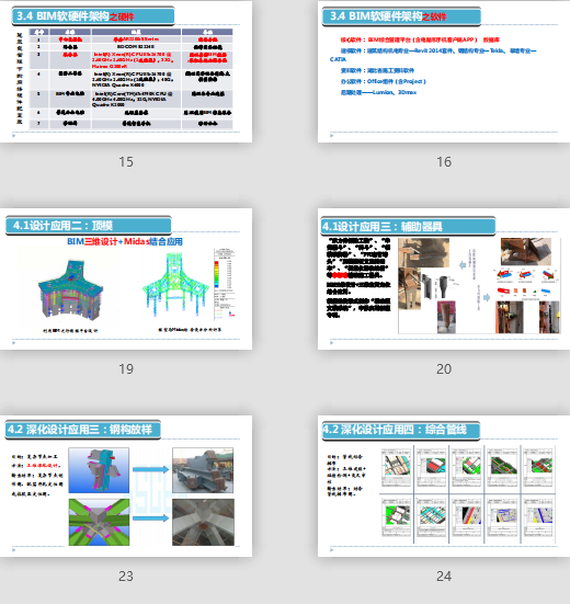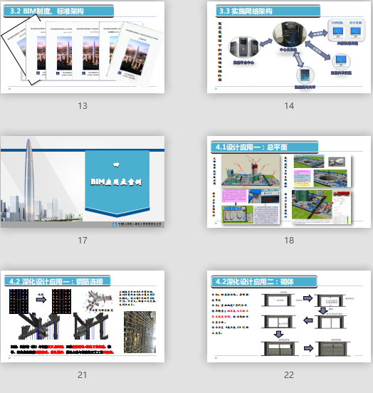 附件大?。?1.7MB所屬分類:BIM資料分享會(huì)員:芳華分享時(shí)間:2021-09-08最后更新:資源簡(jiǎn)介/截圖: 01 項(xiàng)目簡(jiǎn)介 02 BIM實(shí)施路線 03 BIM實(shí)施資源配置 04 BIM應(yīng)用點(diǎn)案例 05 BM創(chuàng)新探索 06 心得體會(huì) 1.利用BIM技術(shù),提高現(xiàn)場(chǎng)施工方案的合理性與科學(xué)性 2.利用BIM綜合信息平臺(tái),進(jìn)行信息共享,協(xié)調(diào)各專業(yè)問題,提高分包協(xié)調(diào)管理能力和信息溝通效率 3.借助BIM技術(shù),進(jìn)行工序推演,優(yōu)化施工工藝 4.利用BIM技術(shù)為技術(shù)、生產(chǎn)、商務(wù)、質(zhì)量安全等各系統(tǒng)提供便利,提高工作效率“承力件拆除工裝”、“串筒漏斗”、“料斗”、“鋁模鎖腳器”、“PVC套管堵頭”“爬模附板支座轉(zhuǎn)運(yùn)車”、“測(cè)量?jī)x器收納箱”等非標(biāo)準(zhǔn)輔助施工器具。BIM三維設(shè)計(jì)+三維空間定位結(jié)合應(yīng)用。 根據(jù)結(jié)構(gòu)形式制作“滑動(dòng)型支模系統(tǒng)”,申報(bào)實(shí)用新型專利。主塔樓共有四道外伸臂桁架,每道伸臂桁架與核心筒共有12處相連,核心筒外伸鋼節(jié)點(diǎn)構(gòu)件多,體量大,鋼筋工況復(fù)雜,交叉作業(yè)多。問題:鋼板墻(梁)與鋼筋交叉點(diǎn)處理,三維虛擬綁扎+綁扎工藝經(jīng)驗(yàn),推導(dǎo)、深化優(yōu)化鋼筋連接形式、綁扎順序,解決土建與鋼結(jié)構(gòu)交叉工藝可實(shí)施。目的:砌筑標(biāo)準(zhǔn)化、合理排磚節(jié)材 方法:虛擬砌筑+用料分析 結(jié)果輸出:砌體施工三維工 序交底流程圖、標(biāo)準(zhǔn)化砌體工序手冊(cè)。 該方法在《施工技術(shù)》刊物上發(fā)表。目的:復(fù)雜節(jié)點(diǎn)加工 方法:三維深化設(shè)計(jì), 輸出結(jié)果:復(fù)雜節(jié)點(diǎn)制作圖、配筋開孔定位圖或接駁器定位圖。目的:管線綜合排布 方法:三維建模+碰撞檢測(cè)+交叉審核 輸出結(jié)果:結(jié)合管線排布圖。目的:節(jié)材、自動(dòng)化生產(chǎn) 方法:建模+revit軟件優(yōu)化分節(jié)+自動(dòng)化生產(chǎn)線控制器數(shù)據(jù)交換 輸出結(jié)果:分節(jié)料單、定尺寸鋼板原料、自動(dòng)生產(chǎn)線加工數(shù)據(jù)。目的:復(fù)雜立面腳手架搭設(shè)方案 方法:幕墻建模+虛擬搭設(shè)+受力計(jì)算 輸出結(jié)果:C3系統(tǒng)幕墻腳手架搭設(shè)示意圖、復(fù)雜立面腳手架搭設(shè)方案及交底。