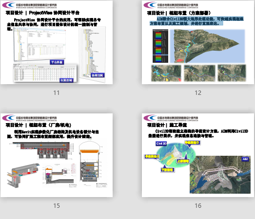 附件大?。?.24MB所屬分類:BIM資料分享會員:芳華分享時間:2021-09-08最后更新:資源簡介/截圖:uf06c 成立時間:1957年 uf06c 員工人數(shù):約1500人 uf06c 年營業(yè)額:約20億元 昆明院是中國國家特大型綜合甲級勘測設計科研單位,位居中國勘察設計綜合實力百強前列,并由外經(jīng)貿(mào)部授權可對外開展經(jīng)濟技術,累計承擔國內(nèi)外大、中、小型水電站工程200余座,營業(yè)服務范圍廣泛,主要包括: uf06c 水電水利、風電規(guī)劃研究、咨詢與評估, uf06c 工程項目勘察、設計、科研試驗, uf06c 工程總承包、項目管理、監(jiān)理, uf06c 水電、風電項目的投資與經(jīng)營,業(yè)務合作, uf06c 環(huán)境保護設計、水土保持設計uf06c 路橋設計、工業(yè)與民用建筑設計 uf06c 巖土工程設計與施工 uf06c 水資源評價、安全評價、地質(zhì)災害評價 uf06c 勘測定界、工程監(jiān)測 uf06c 工程概預算項目設計以Civil3D、Revit、 Inventor 等為各專業(yè)BIM建?;A,以AIM(Autodesk Infrastructure Modeler)為施工總布置可視化和信息化整合平臺。利用AIM,在其他BIM建模軟件的支撐下,可快速實現(xiàn)工程從整體到細部的可視化和信息化,實現(xiàn)模型文件設計信息的自動連接與更新。ProjectWise 協(xié)同設計平臺的應用,可幫助實現(xiàn)各專業(yè)信息共享與協(xié)同,進行項目整體設計的統(tǒng)一控制與管理。AIM聯(lián)合Civil3D強大地形處理功能,可快速實現(xiàn)樞紐方案布置以及施工規(guī)劃,并進行直觀表達。