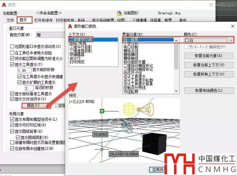 切換到顯示選項(xiàng)卡,單擊“顏色”按鈕,將二維空間背景顏色設(shè)置為白色,如圖所示。